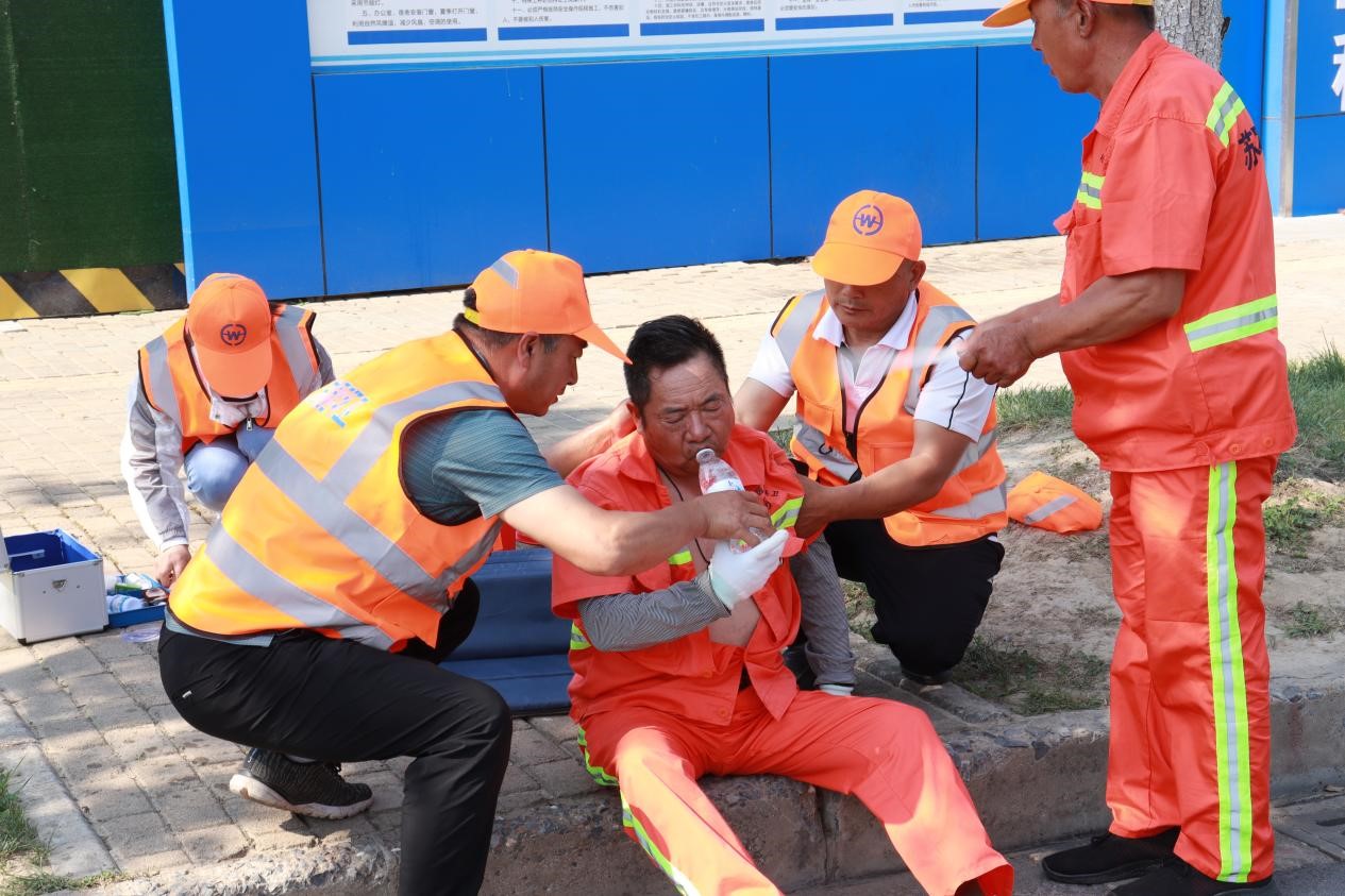 此次演練模擬一名環(huán)衛(wèi)工人在作業(yè)過程中,突然感到頭暈、心慌乏力,立即向主管人員電話求助。主管人員隨即趕到現(xiàn)場查看情況,發(fā)現(xiàn)環(huán)衛(wèi)工人躺坐在現(xiàn)場,面色潮紅、大汗淋漓,精神狀況不佳,系中暑跡象,立即向項目經(jīng)理報告,聯(lián)系應(yīng)急救援人員,并呼喊附近作業(yè)人員將其攙扶到陰涼處,解開衣扣散熱,應(yīng)急救援人員趕到現(xiàn)場后,立即用濕毛巾、酒精棉擦拭身體,涂上清涼油,喂服藿香正氣水、淡鹽水......,經(jīng)過初步救護,中暑人員癥狀得以緩解后,隨即將其送往園區(qū)社區(qū)衛(wèi)生服務(wù)中心進一步治療。
